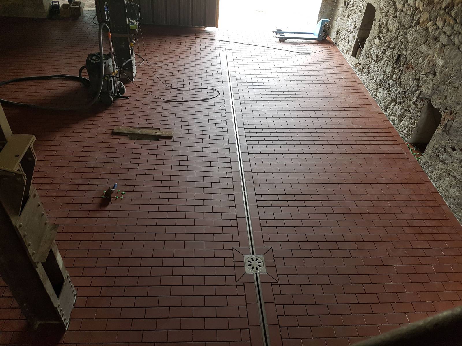 - Pose collée du carrelage anti-acide avec joints époxy résistants aux agents de nettoyage.